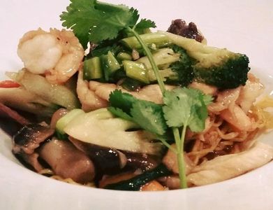 wok fried yellow egg noodles with buk choy, carrots, mushrooms, baby corn, broccoli, bell peppers, onions, oysters sauce 17.25